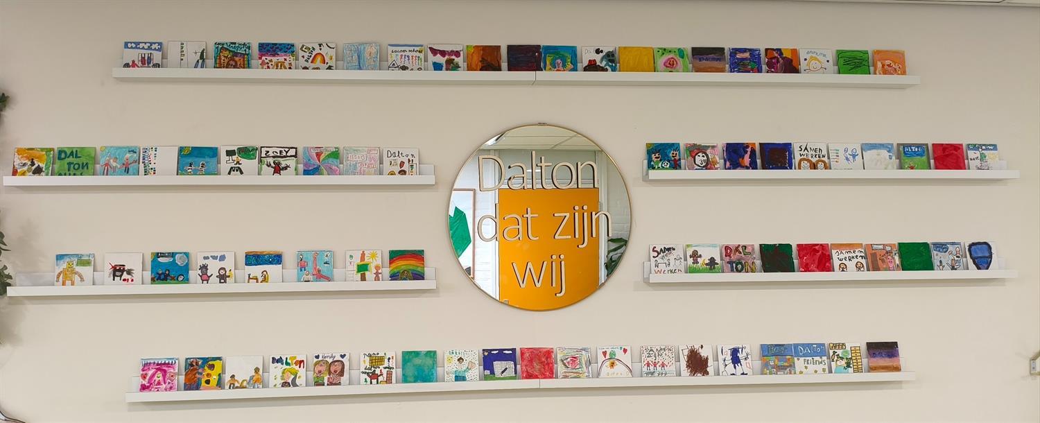 Elke leerling heeft een schilderijtje gemaakt met daarop hun beeld van dalton. Dit kan een daltonkernwaarde, zoals samenwerken zijn, maar ook materialen zoals de takentoren die we inzetten.